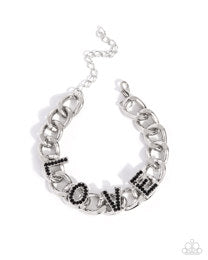sliver bracelet with black rhinestones in the word Love